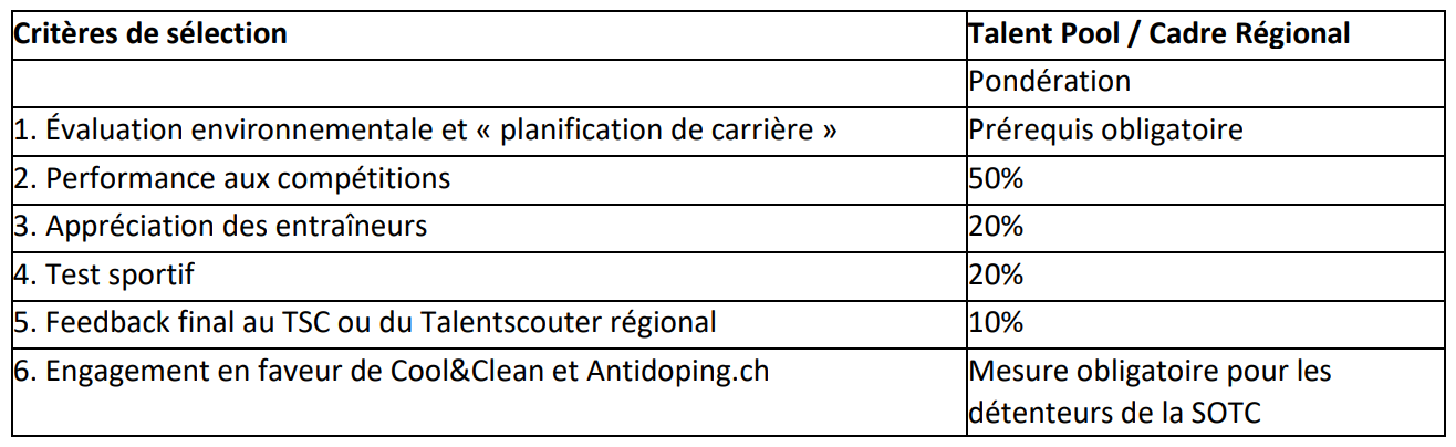 Les critères suivants sont valables pour les classes juniors, tels que définis dans le Concept de Promotion de la Relève et dans la Structure de Cadre.