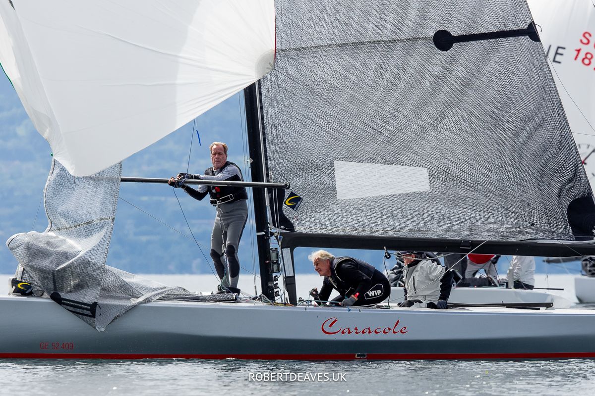 Caracole won the opening race of the day in very light winds, after the Britton Chance Jr. designed Evolution, Desirade (SUI 113, Patrick Huguenin, Antonin Radue, Pascal Radue) led round the first two marks. She led round the top from the right side, extended downwind and maintained the lead until the second upwind when Caracole passed her. A second race was attempted but abandoned after the start and the fleet was sent back to the harbour to wait.
