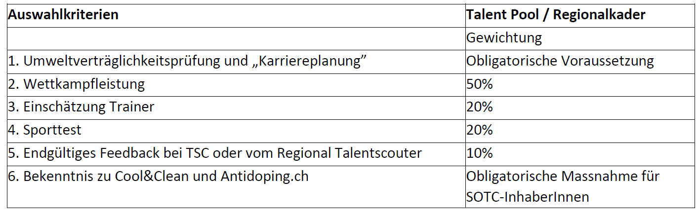 Die folgenden Kriterien gelten für die Jugendklassen, wie sie in der NWFK und Kaderstruktur aufgeführt sind.
