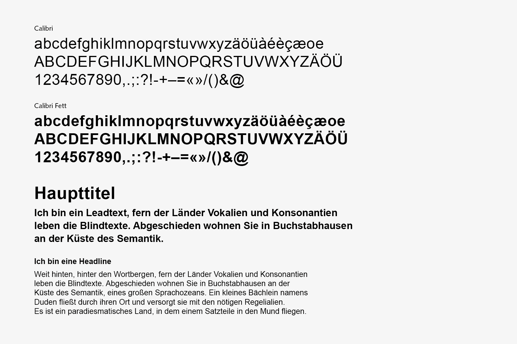Die Sachlichkeit und Klarheit des Corporate Designs spiegelt sich auch in der Wahl der Hausschrift wider. Es wird deshalb nur mit einer Schrift und ihren Schriftschnitten (normal, fett & kursiv) gearbeitet – Der Systemschrift Calibri